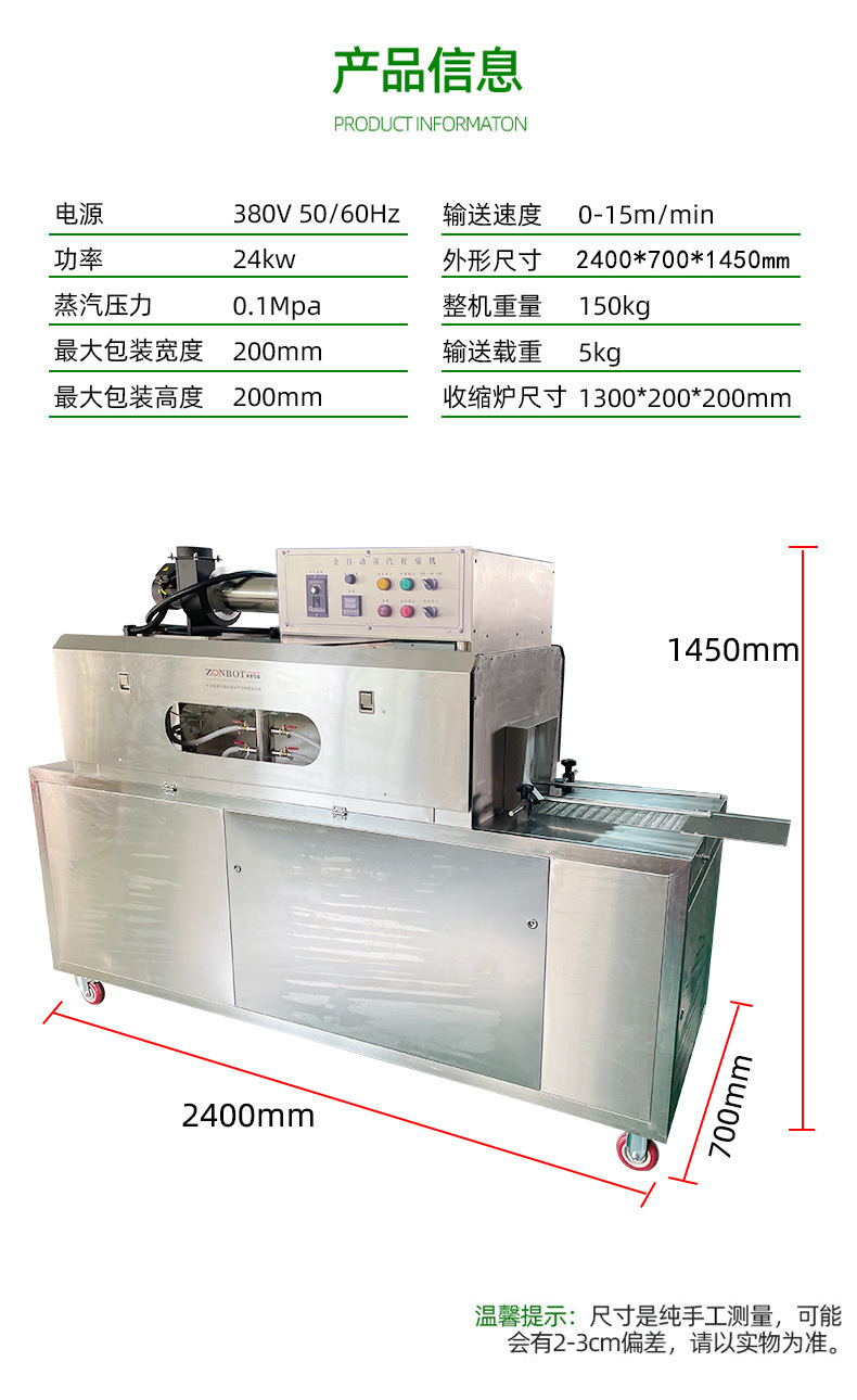 收缩速度快:蒸汽的高热量能够快速传递给包装膜,使包装膜迅速收缩,提高包装效率,可适用于高速生产线,满足大规模生产的需求.
