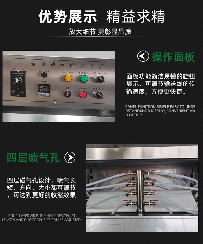 节能环保优势:与单独使用传统包装设备和收缩设备相比,蒸汽收缩一体机在能源利用上可能更高效。蒸汽收缩过程相对节能,而且一体机的集成设计减少了设备整体的能耗,同时也降低了对工作空间的要求,符合节能环保的理念。